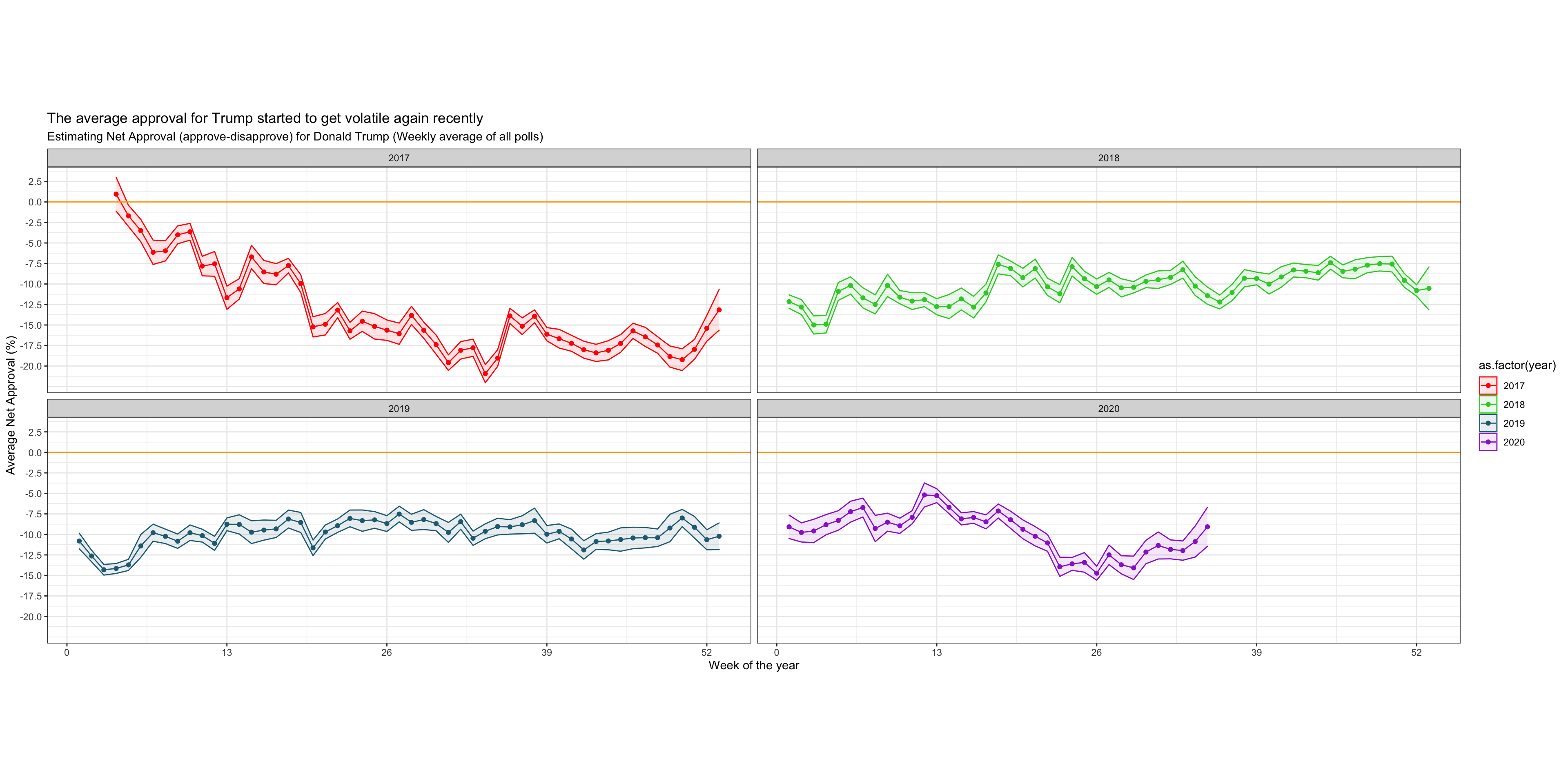 We calculate the average net approval rate (approve- disapprove) for each week since he got into office. We plot the net approval, along with its 95% confidence interval.